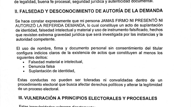 Asimismo, enfatizó que debe iniciarse una investigación penal por presunta falsedad documental contra quienes resulten responsables de haber presentado la denuncia falsa, señalando que alguien tuvo que registrar formalmente el trámite ante el órgano electoral.