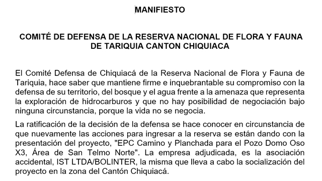 La representante del Comité de Defensa de Chiquiacá, Juanita Mercado, reafirmó mediante un manifiesto la postura de las comunidades de la Reserva Nacional de Flora y Fauna de Tariquía de impedir el ingreso de empresas petroleras a su territorio.