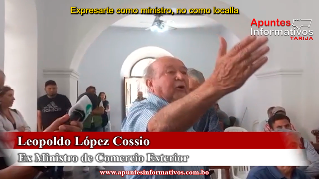 Durante la presentación del proyecto de riego Carrizales, el exparlamentario y cívico tarijeño Leopoldo “Polilla” López manifestó su descontento porque, según su criterio, el ministro de Medio Ambiente y Agua, Álvaro Ruiz, no incluyó el componente más relevante del proyecto: el estudio a diseño final de la represa, dejando únicamente la parte vinculada al riego.