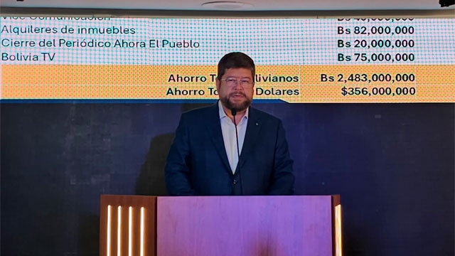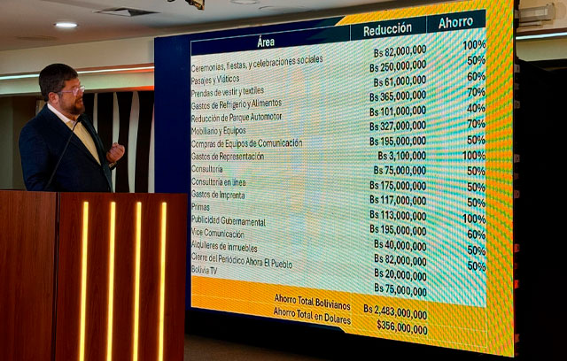 El decreto logra un ahorro de 2.483 millones bolivianos cortando gastos estatales que Samuel describió como “los privilegios de una élite burocrática, que son una pesada piedra colgada del cuello de la economía, capaz de hundirla en la hiperinflación”.