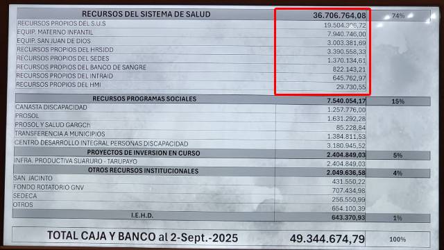 El mandatario detalló que, en total, la gobernación dispone de 49 millones de bolivianos en caja y banco, distribuidos entre distintas instituciones como el SUS, el materno infantil, San Juan de Dios y el banco de sangre, entre otros.