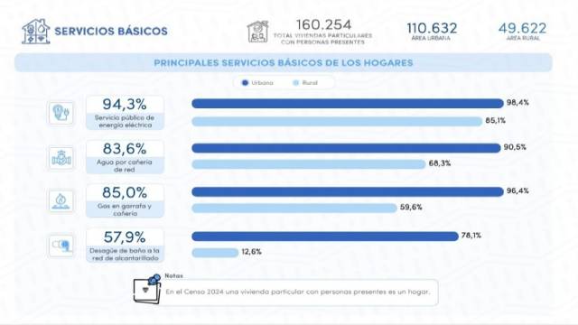 La electricidad es el servicio con mayor progreso. En el área urbana, el 99% de las viviendas cuenta con este recurso, mientras que en el área rural la cobertura alcanza al 89.2%, gracias en parte a la incorporación de paneles solares que han llevado energía a comunidades alejadas. A pesar del avance, aún más de 5.000 hogares rurales permanecen sin este servicio básico en pleno 2024.