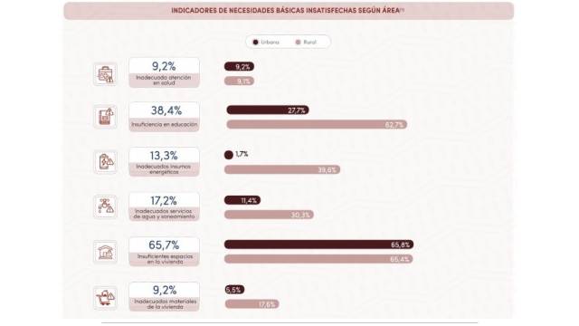 Los factores que inciden en esta situación están relacionados con las seis dimensiones evaluadas por el NBI. La calidad de las viviendas y el acceso a la energía muestran mejoras sostenidas, pero persisten problemas graves como el hacinamiento —que afecta a más del 65% de la población—, la falta de servicios básicos en áreas rurales y la desigual cobertura educativa y de salud.